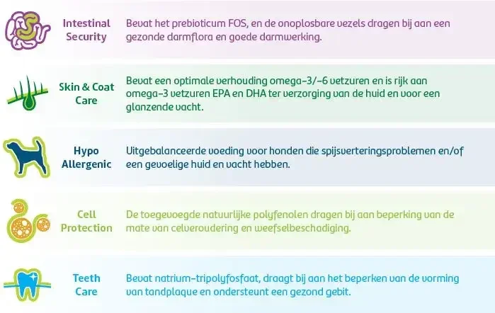 Het bevat de juiste dagelijkse hoeveelheden eiwitten, vetten, koolhydraten, vitaminen en mineralen die bijdragen tot een goede gezondheid van uw hond.