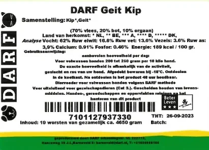DARF Geit Kip is een gezonde voeding op basis van vers vlees, organen en gemalen bot van niet dragende botten.