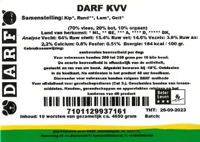 DARF KVV is compleet en is een mix van vers vlees, organen en gemalen bot van vier diersoorten.