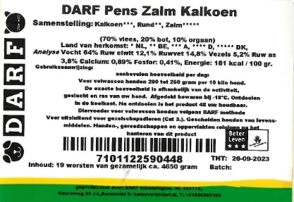 Darf Pens Zalm Kalkoen is een mooie combinatie van drie diersoorten namelijk Rund, Zalm en Kalkoen.
