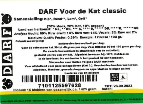 DARF voor de Kat Classic is net als de variant voor de hond: een vers vlees product, dat BARF compleet is.