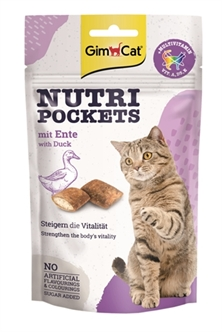 De Gimcat Nutri Pockets Eend 60 gr is aanvullend diervoeder voor katten, een heerlijke kattensnack met een krokante buitenkant en zachte binnenkant zonder kunstmatige kleur- en smaakstoffen. Katten zijn gek op bijzondere smaakcombinaties en structuren!